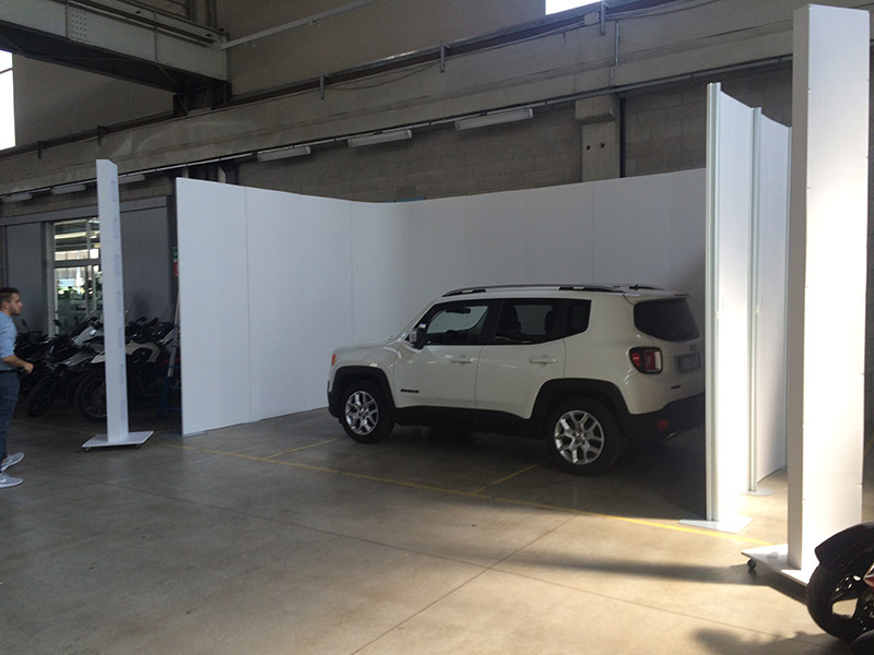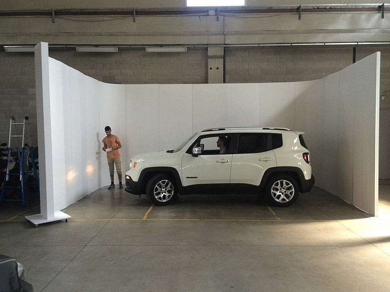 Dieses Fotomodell ist aufklappbar, wodurch ein Auto hineinfahren kann, um anschließend fotografiert zu werden. Auch die LED-Leuchten sind auf Rädern beweglich.