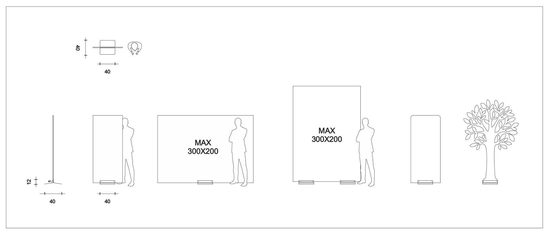 Empfohlenes Material für die Platte: 20 m Sandwich, leicht und zusammengesetzt. Geeignet für Geschäfte, kleine Stände, als Beschilderungstotem, aber auch als Vorlagenhalter für eine Veranstaltung.